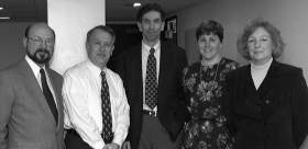 Managers for the University's new Integrated Administrative Systems project gathered recently to celebrate implementation of the first phase of the software for users in admissions and related offices. From left are Leo Neveu, chair of the IAS Steering Committee; former Executive Vice President Carl Carlucci; Michael DeRensis, student administration functional implementation team leader; Marybeth Salmon, project manager; and Ginger Bailey, student administration technical implementation team leader.