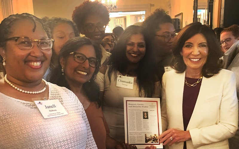 Dr. Janell Hobson, who attended the event along with Chamanka Gamage, a 2023 WGSS graduate student alum, stated, “This is such a momentous occasion, not just for women's history but also New York State history. This is an important reminder of how New York women have always been at the helm of advancing social justice, anti-racism, and feminism, from liberators like Sojourner Truth and Harriet Tubman to abolitionist allies and suffragists like Susan B. Anthony, all the way to the modern women's liberation movement in the 1960s and 1970s, including local feminists like Barbara Smith, who was a key founder in the Combahee River Collective, which advanced identity politics and intersectionality. This is an important legacy, and we're happy to be part of this milestone event.” Dr. Rajani Bhatia attended with Bria Nickerson, current graduate student and Coordinator of the WGSS Teaching Collective, the longest-running peer-education program based in feminist pedagogy in the nation, begun in 1977. Dr. Bhatia commented, “I am proud to celebrate this event to remind us of the critical need of our field when the fundamental rights of girls and women, LGBTQ* persons, and even the freedom to learn are under attack. Students at UAlbany are drawn to our program for validation and for a diverse community in which to process current events and recharge for the ongoing struggle.”