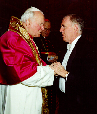 President Clinton wanted his new Ambassador to the Vatican, the first Democrat to hold this post, to expand the role of his mission. As Ambassador to the Vatican, Flynn represents the United States on issues of social and economic justice in trouble spots around the world. Since assuming his duties in Rome, Ambassador Flynn has done just that--representing the President in heading up earthquake relief efforts in India, and reviewing and reporting to the White House on humanitarian aid efforts in Uganda, Kenya, Sudan, Somalia, Haiti and, most recently, in Bosnia. Ambassador Flynn has been involved in peace efforts in Northern Ireland and has been working with Vatacan officials and other diplomats regarding the problems in South and Central America and developments in Cuba. He was instrumental in securing an agreement to begin the formal process of establishing full diplomatic relations betwen Israel and the Vatican.