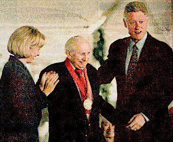 ![]() PHOTO CREDIT: RON EDMONDS/AP Pres. & Mrs. Clinton escort Studs Terkel after presenting him with a 1997 National Humanities Medal last September |