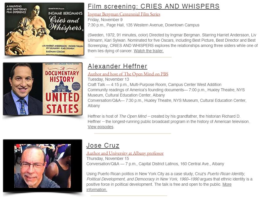 [an error occurred while processing this directive] Bibbe Hansen Elizabeth Acevedo Film screening : MILK John Leland Film screening: IN THE LAST DAYS OF THE CITY Sean Penn New York State Author and New York State Poet installation ceremonies More about the Albany Book Festival
