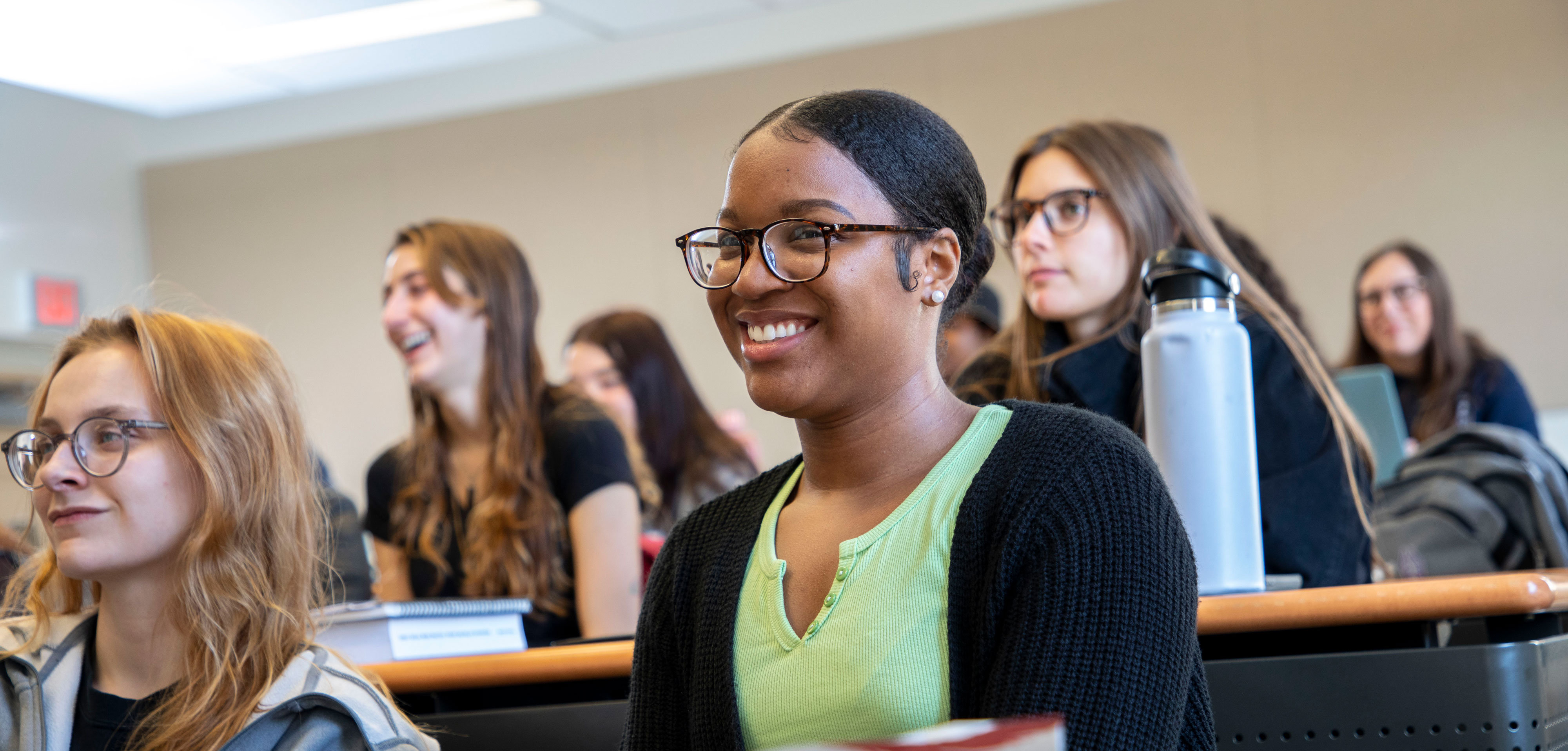 Multiple students laugh and smile while seated inside a classroom with tiered rows of seating. Multiple students laugh and smile while seated inside a classroom with tiered rows of seating.