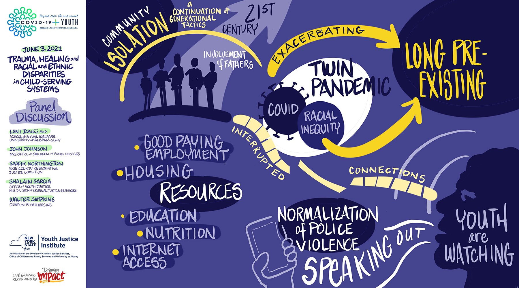 This series of web-based panel discussions ask youth justice stakeholders from around the country to explore the pandemic's continued impacts on youth, their families, and their communities; as well as concrete actions that will move the field closer to eliminating racial and ethnic disparities, ensuring equity and justice, and prioritizing individual and communal health and well-being.