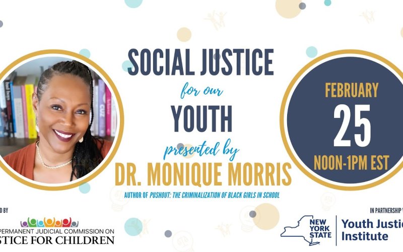 In February 2021, the YJI, in partnership with the NYS Permanent Judicial Commission on Justice for Children (PJCJC), hosted two virtual sessions on "Social Justice for Our Youth," presented by Dr. Monique Morris. Dr. Morris an award-winning author, social justice scholar, and executive producer and co-writer of the critically acclaimed documentary PUSHOUT: The Criminalization of Black Girls in Schools.